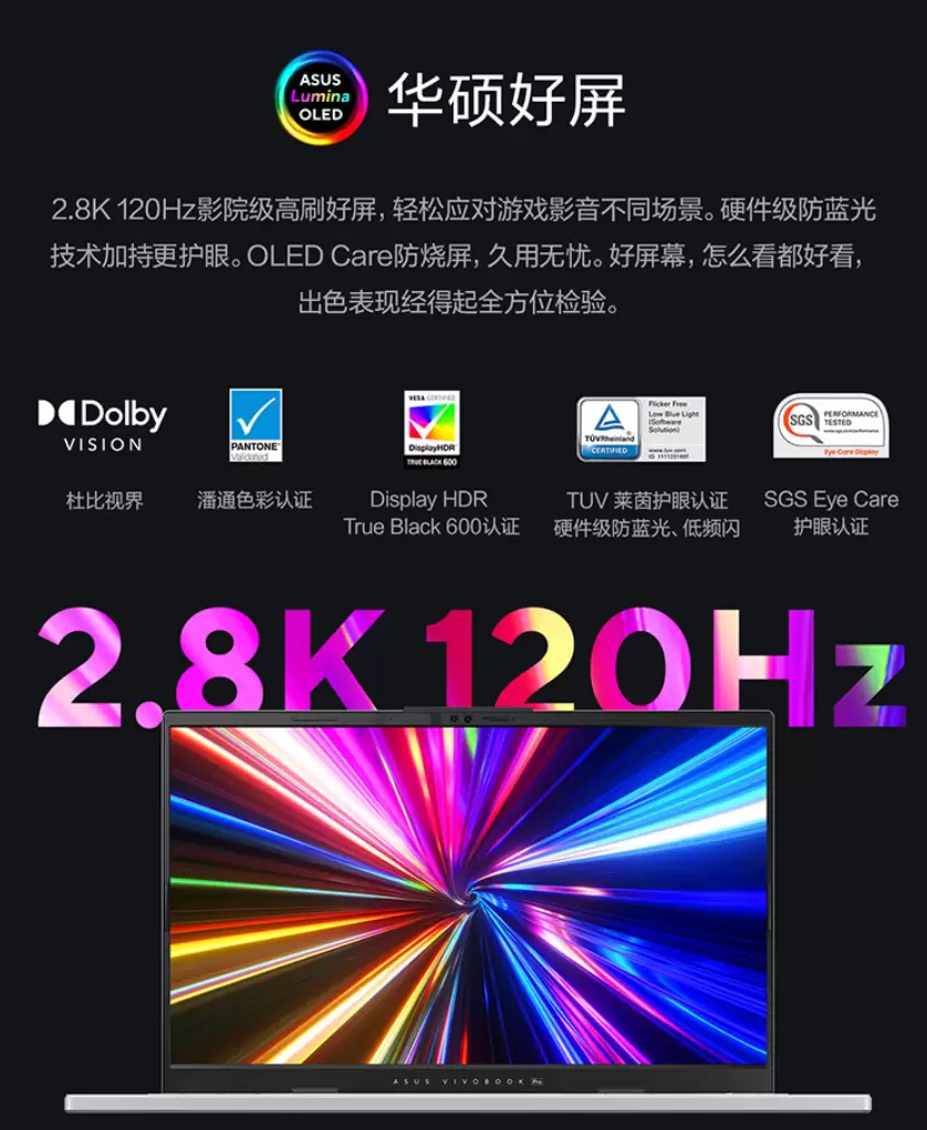为给用户打造震撼视效体验,华硕无畏Pro15 2024将延续华硕好屏战略,搭载一块2.8K高分辨率、120Hz刷新率影院级OLED Care防烧屏,刷新快,画面分毫毕现,轻松应对工作、影音娱乐、游戏等不同场景;0.2ms疾速响应,拖影更小,峰值亮度高达600nit,100%P3广色域覆盖,支持四种专业色域切换,通过Pantone色彩认证,色彩更加绚丽饱满;支持杜比视界,并通过Display HDR True Black 600认证,带来震撼的HDR视效;还通过了TUV莱茵硬件级低蓝光、无频闪认证以及SGS Eye Care护眼认证,持久使用也能有效呵护用眼健康。