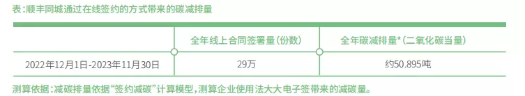 顺丰同城不仅通过科技赋能持续领跑行业,保持稳步发展,更在企业社会责任中有着突出贡献。据《2023年签约减碳与低碳办公白皮书》所示,顺丰同城积极响应国家“双碳”战略号召,通过在线签约方式降低碳排放。数据显示,顺丰同城年度通过使用法大大电子合同,减少约29万份纸质合同的使用,降低约50.895吨二氧化碳当量的碳排放。