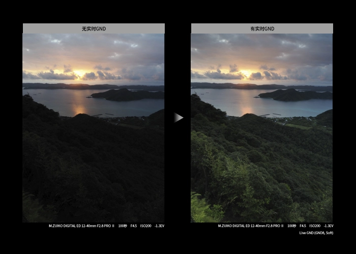 2. “LIVE GND”拍摄功能能够在确认GND档数、类型的同时以半ND滤镜效果进行操作;