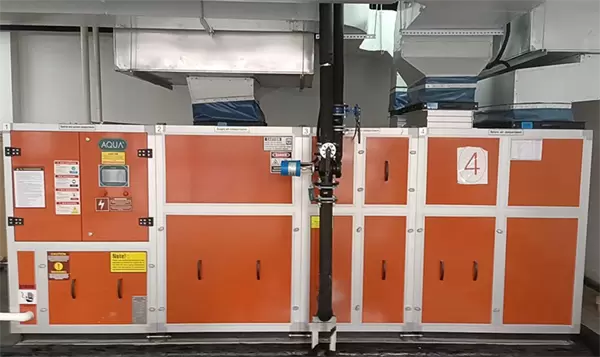 广州千叶自主研发的AQUA爱克三集一体恒温除湿热泵,集除湿、恒温、池水加热、热能回收、新风处理五大功能于一体,在空气源与热回收技术赋能之下,可以用更少能耗解决雅安某高端酒店室内泳池高湿高氯难题,一年四季保证室内泳池湿度、水温、室温适宜。