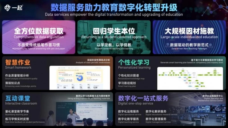 一起教育科技基于“一教一学”平台及智慧笔,在不改变纸笔作答习惯下,通过智慧笔全方位采集课堂、作业、考试、校内、校外、线上线下等综合性数据,以数据驱动教学方式变革,回归学生本位,以学定教,以学促教,推动数字化教育转型升级。截止目前,一起教育科技的数字化一站式服务已助力全国多个教育区域实现大规模因材施教,为上海闵行区、长宁区、松江区,以及北京市西城区等区域学校,提供数字化教育评价、个性化学习、互动课堂、智慧作业等方面的产品和服务。
