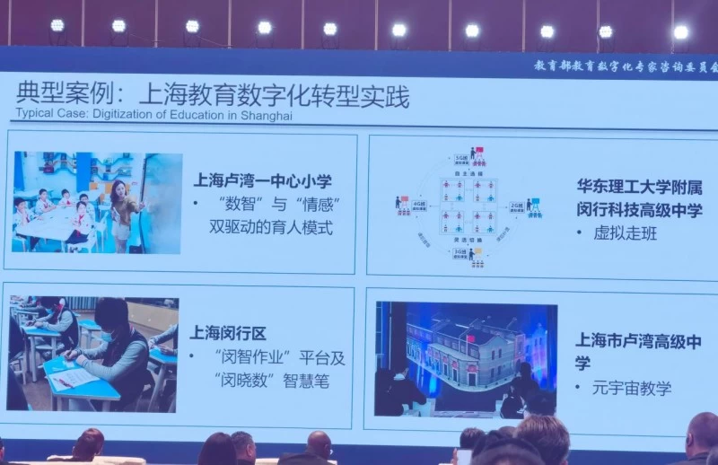 中国教育部教育数字化专家咨询委员会主任、武汉理工大学校长杨宗凯在1月30日的大会主旨发言中特别提到,上海的教育数字化转型实践典型代表,包括以上海市卢湾一中心小学为代表的“数智”与“情感”双驱动的育人模式;作为全国首批智慧教育示范区,上海闵行区以“闵智作业”平台及“闵晓数”智慧笔为代表,开展由数据驱动的大规模因材施教,以及华东理工大学附属闵行科技高级中学开展的虚拟走班和上海市卢湾高级中学进行的元宇宙教学等。