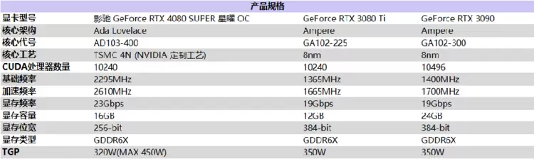 首先来看一下影驰GeForce RTX 4080 SUPER 星曜 OC的的规格参数与GeForce RTX 3080 Ti 和GeForce RTX 3090 的对比: