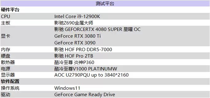 在游戏测试部分选择了经典的显卡杀手《赛博朋克 2077》和时下热门游戏《幻兽帕鲁》作为测试方向,同时为了进一步让用户了解影驰 GeForce RTX 4080 SUPER星曜 OC的性能体现,还选择了GeForce RTX 3080 Ti 和GeForce RTX 3090 的实测数据作为对比。