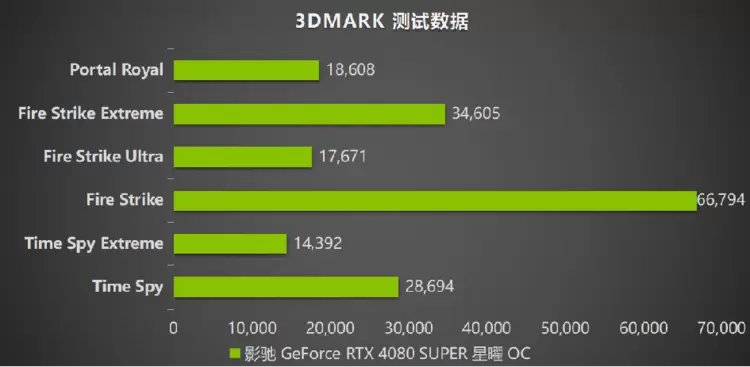 影驰 GeForce RTX 4080 SUPER星曜 OC在3DMARK测试中,显卡分数为28694分。3DMark Fire Strike DX11测试的分数也达到了66794,在3DMark Portal Royal光追测试的成绩则为18608。总体分数表现算的上是优异,即便在运行3A光追游戏大作时,也能够给与用户们一个优异的性能体现。
