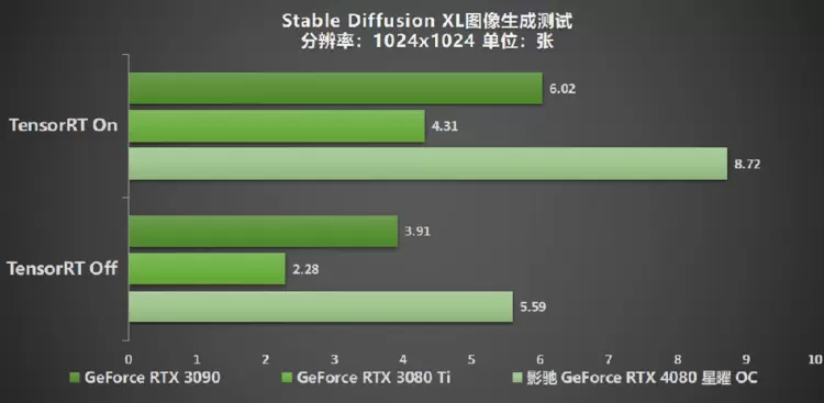 在更为严峻的SDXL模式下,生成分辨率为1024x1024的图像,可以看到影驰 GeForce RTX 4080 SUPER星曜 OC 每分钟的生产力为8.72张。反观GeForce RTX 3080 Ti的数据,则为4.31张。NVIDIA RTX 40系列GPU 生产力的过人之处是显而易见的。