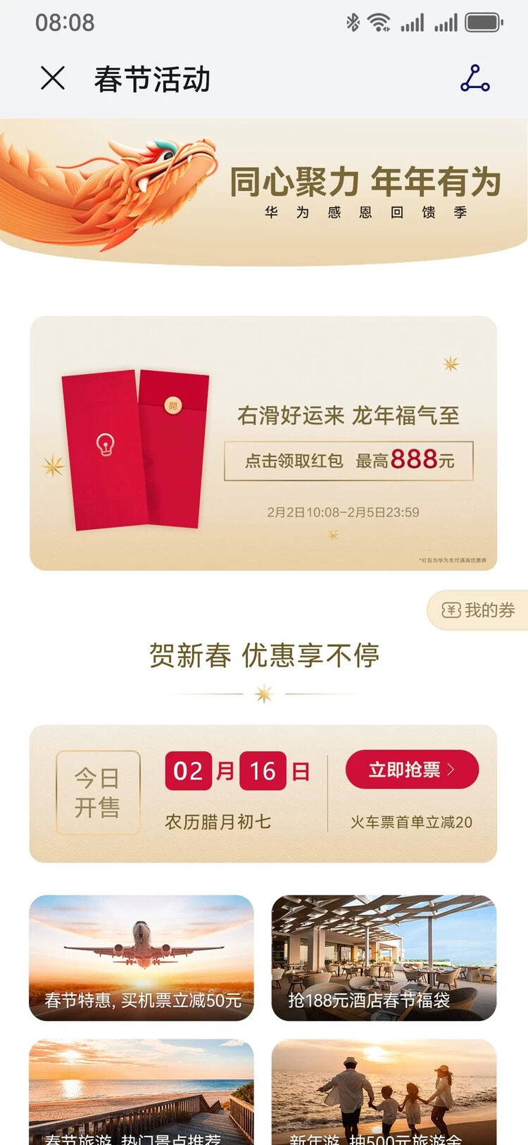 有了这些红包加持,这个春节假期将会变得更加轻松自如。想要去旅行的朋友们,有了这笔大额红包,订酒店、机票都能更省钱,如果你足够幸运抢到了888元的超大红包,机票升舱、五星酒店都能轻松预定无压力。想要在节前换新手机奖励自己的朋友们,在华为商城购买Mate60 Pro时也能省下一笔。即使抢不到888的红包,也会有最低8.88元红包,打车出行立减后只需要几块钱后者只需几分钱。如果想要去看电影,也不用因为春节档票价高而犹豫,使用华为支付红包直接抵扣,贺岁档好片不再错过…