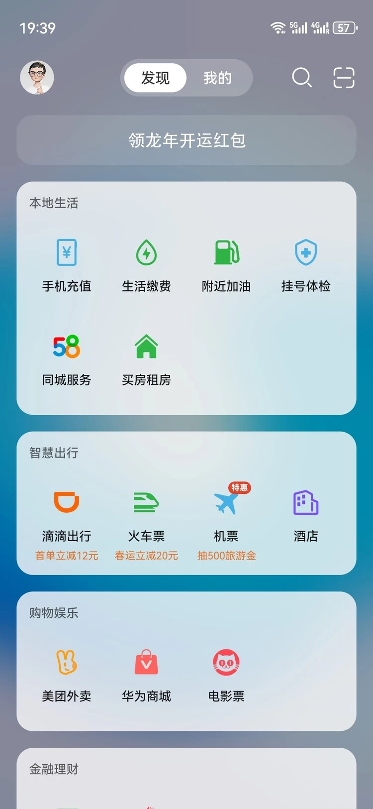 用华为手机的朋友们,负一屏用顺手没?只需在手机桌面右滑至负一屏的“发现”页,就能直达外卖、机票、酒店、火车票、电影票、手机充值等生活中常用的服务,界面清晰直观,不用下载、不需要搜索,快捷使用。随着2024年春节临近,华为负一屏“发现”页上有非常丰富的优惠,可用于下单日常服务抵扣,2月2日10:08至5日23:59还可以领龙年开运红包券,最小8.88元,最大888元,下面就一起来看看华为负一屏都有哪些宝藏功能和优惠福利吧!