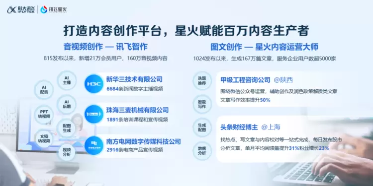 同时,讯飞星火打造出内容创作平台,一站式完成“图文、音频与视频”等优质内容生成,帮助百万内容生产者解放生产力。音视频创作工具“讯飞智作”自去年8月15日发布以来,新增了21万会员用户,生成了160万音视频内容;图文创作工具“星火内容运营大师”自去年10月24日发布以来,已服务了5000+企业,生成了超150万篇文章,助力内容创作者高效生产。