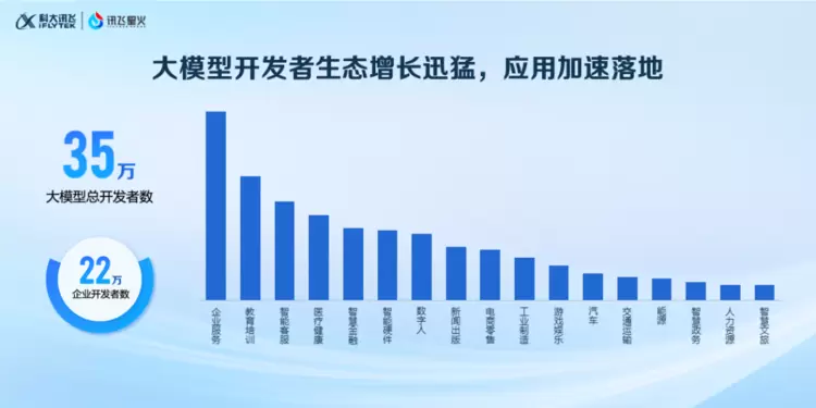 唯有生态繁荣,才有人工智能大未来。随着大模型持续突破,讯飞AI开发者生态增长迅猛,持续领先。自星火大模型发布以来,大模型开发者总数超35万,其中企业开发者22万,遍布企业服务、教育培训、智能客服、医疗健康等领域。