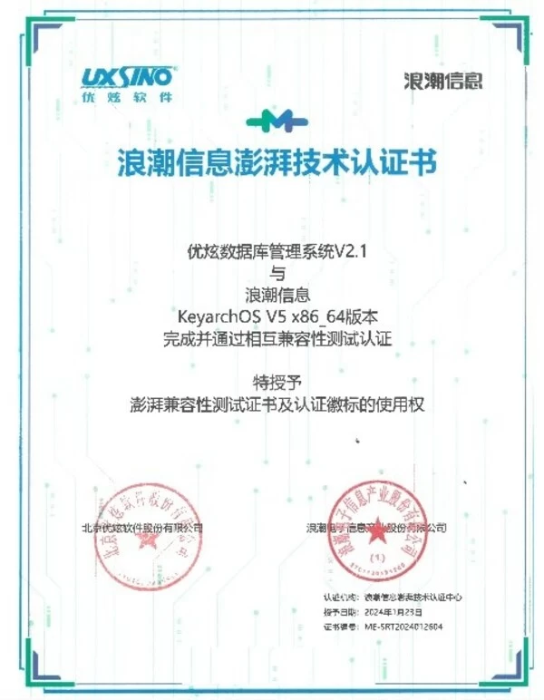 日前,优炫数据库(简称UXDB)与KeyarchOS完成浪潮信息澎湃技术认证,经双方测试,产品可以共同运行,整体系统稳定,产品体验良好,可满足用户安全性、可靠性及关键性应用需求。