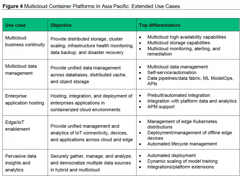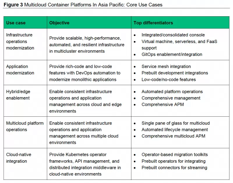 《报告》明确了多云容器平台的核心用例:基础设施运营现代化、应用现代化、混合/边缘赋能、多云平台运营和云原生集成。这些是亚太地区企业最常寻求并期望多云容器平台供应商解决的用例。