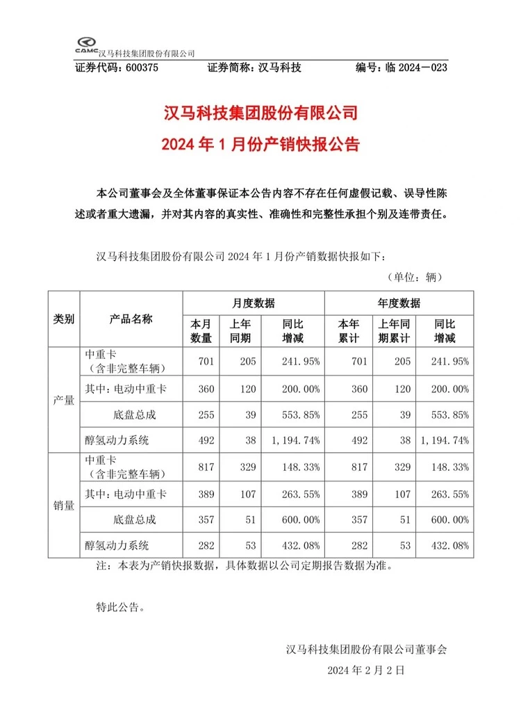 汉马科技2月2日公告2024年1月份产销快报,中重卡产销量分别达到701辆和817辆,分别同比增长241.95%和148.33%。其中,电动中重卡产销量分别为360辆和389辆,分别同比增长200.00%和263.55%;醇氢动力系统产销量分别为492辆和282辆,分别同比增长达到1194.74%和432.08%。