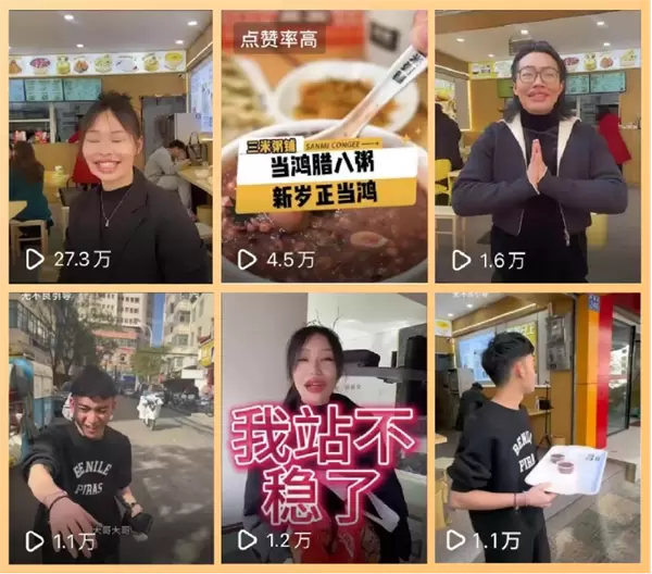 不仅如此,在互联网短视频平台,腊八节前期,三米粥铺品牌总部联合三米加盟商,进行了腊八节短视频矩阵推广,“香肠嘴姐”火出圈,魔性的特效搭配洗脑的声音,在抖音短视频平台小火了一把,单条短视频冷启动自然播放量逼近30万,有效的进行了网络端的品牌强化与传播。