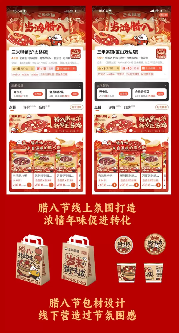 腊月初,三米粥铺全国外卖门店已经完成了腊八节的氛围布置,早早换上了“腊八皮肤”,将腊八节喝粥的氛围感拉满,促进腊八粥转化。搭配线下腊八节包材,打造浓浓的腊八过节仪式感。