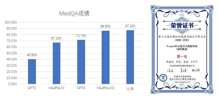 2023年6月,山海大模型医疗专业能力获得新突破,在MedQA任务上超过了Google MedPaLM2,达到了87.1%的优异成绩。此外,在临床执业医师资格考试中,山海大模型的分数提升到了523分(满分600分),这一成绩超越了99%的考生水平。