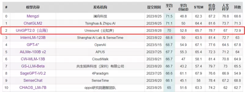 2023年7月和8月,山海百亿及千亿级大模型在C-Eval全球大模型综合性考试评测中分别取得60.3分和70.0分的优异成绩,百亿级模型跻身行业前列,千亿级模型通用能力入围三甲,充分印证了山海大模型在通用基础能力上达到业界第一梯队水准。
