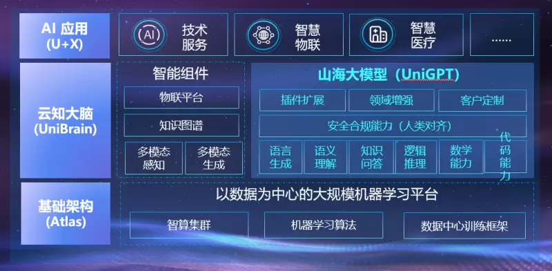 具体而言,云知声作为算法和工程能力深厚的AI新锐企业,凭借过去十余年在深度学习、BERT预训练大模型、Atlas基础架构、海量数据及产业应用等全方位的深厚积累,于2023年5月24日正式发布山海大模型(UniGPT),成为国内首批实现GPT大模型技术升级的团队。