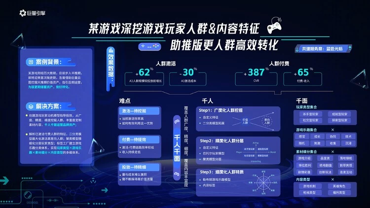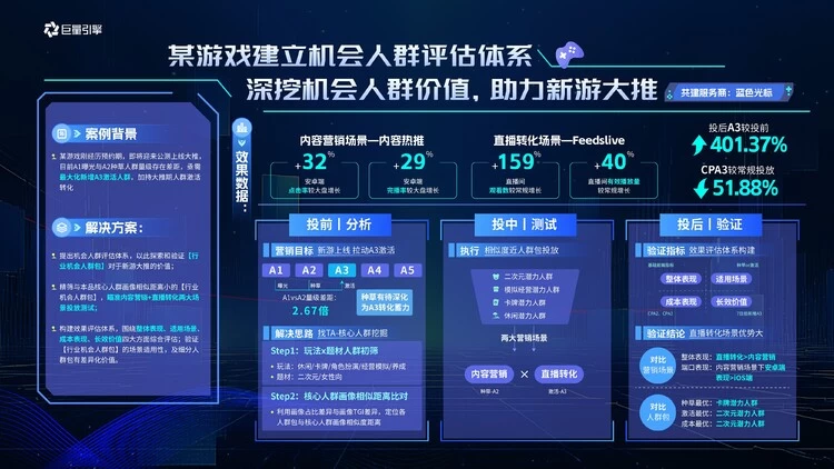 聚焦游戏客户面临的两大用户问题,一个是增量拉新,如何寻找高价值人群;一个是存量提效,如何针对已经触达人群进行加速转化。