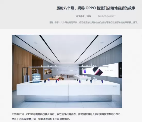 除了物流、仓储的场景有人工智能服务商的身影,各大品牌零售的门店和银行的支付系统里也隐藏着很多人工智能公司的技术。比如人工智能国家队云从科技研发的首个“刷脸支付原型系统”已经在四大银行里投入使用,或许在姚志强提出布局新零售之后,这样的刷脸支付系统也会打入各个零售门店内部,相信云从未来也将给出完美的新零售解决方案。而与旷视科技提供类似的新零售解决方案的图普科技,此前雷锋网有新闻表示已经拿下了OPPO这家大单。光从新闻来看,两家的合作是十分深入的,OPPO方面也举出了证明方案实际有效的案例。单从这一次合作来看,图普科技在新零售上的技术布局应该是相对不错的。目前媒体们对图普科技的印象似乎还停留在鉴黄时期,但很明显图普科技也要来新零售分一杯羹了。