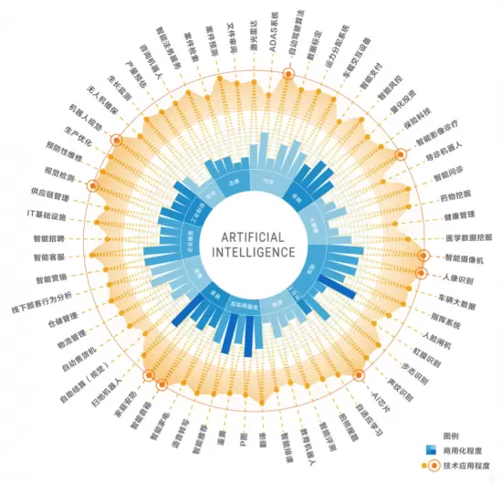 根据亿欧权威发布的《2018中国人工智能商业落地研究报告》,人工智能技术落地最多的领域是安防、金融、互联网服务和企业服务,而技术应用最多的则主要包括自动驾驶算法、智能影像辅助诊疗、人脸摄像头等人脸识别相关应用、智能音箱等语音交互相关服务、视觉检测等工业制造服务、AI芯片的IC设计等等。