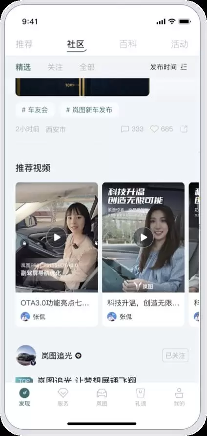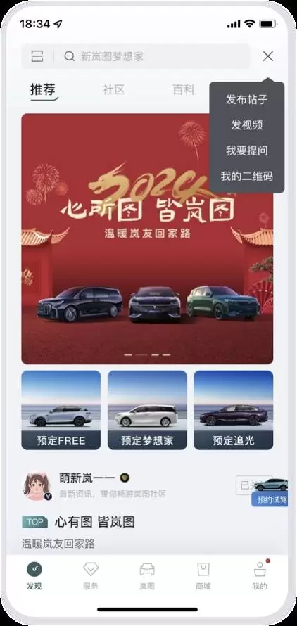为了满足用户对视频分享的需求,新版岚图汽车APP在社区内增加了发视频独立入口,用户只需点击发现页右上角的“+”,选择“发视频”,即可迅速发布自己的视频作品。新的入口为用户提供了一个快捷通道,方便用户可以随时随地分享自己的视频作品。通过新入口,用户既可以从相册中选取现有的视频素材编辑后发布,也可以直接点击“拍摄”,轻松捕捉生活中的每一个精彩瞬间。