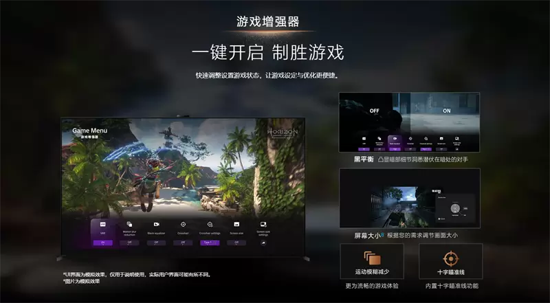 今年索尼电视产品里,还搭载了全新的游戏利器——游戏增强器,除了可以方便地设置VRR可变刷新频率、运动模糊减少的开启与关闭,还可以使用“黑平衡”功能调节暗区亮度,用“屏幕大小”功能调节画面大小,特别是“十字准线”功能,更是堪称FPS玩家的“物理外挂”,让你轻松制敌,称霸全场!