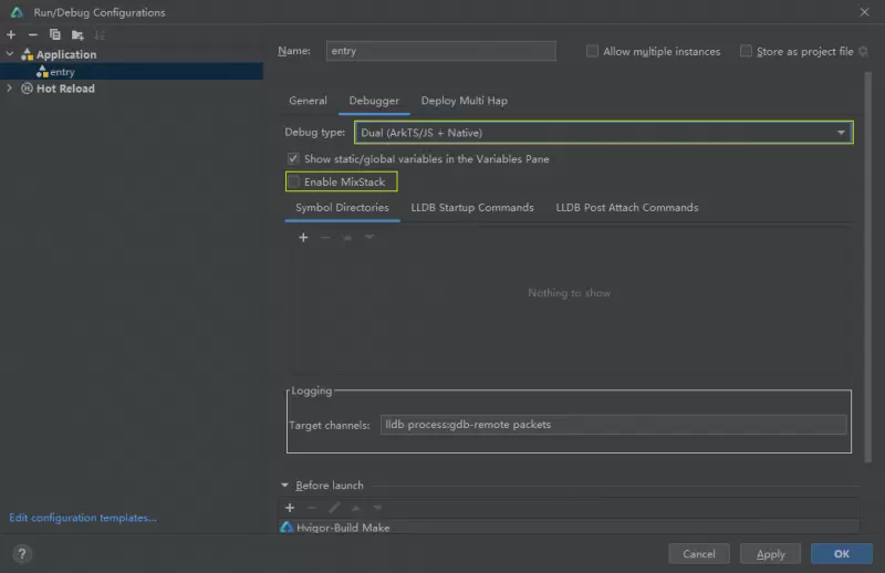 开发者只需在调试设置界面将Debug type设置为“Dual(ArkTS/Js + Native)” ,开启混合调试模式。