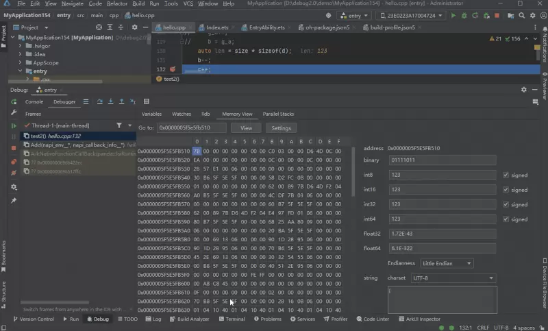 调试C++代码时,DevEco Studio还支持内存查看和修改,开发者可以查看指定地址的内存,进行内存转换、查看变量的内存,以及内存修改等操作。