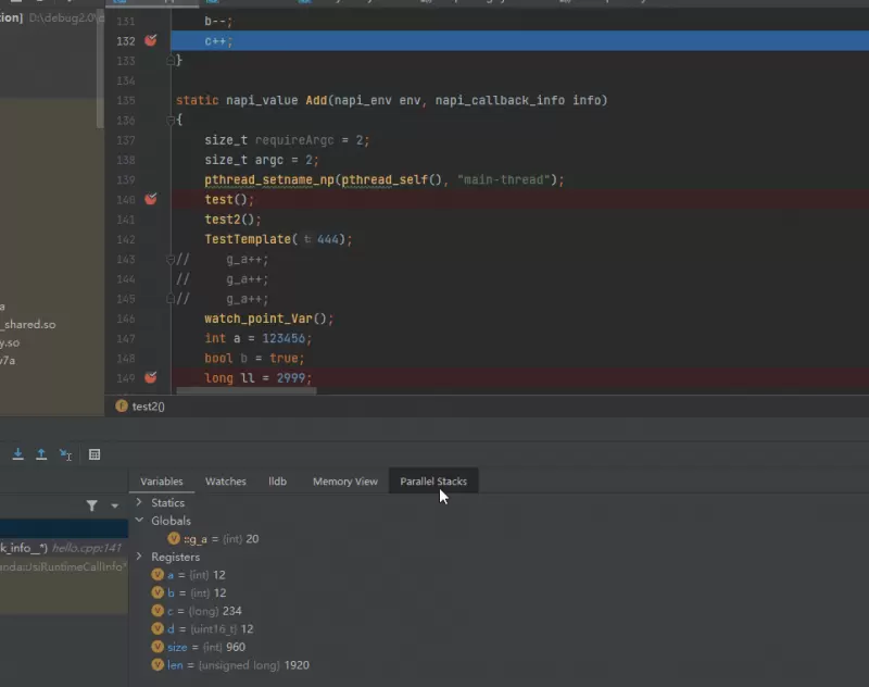 当step into跳入到C++方法的代码中继续进行调试时,DevEco Studio提供了并行栈视图功能,支持在程序停住时,可同时展示多个线程的调用栈信息,并且自动合并重复调用栈,方便开发者分析程序的并发执行情况,以及发现潜在的多线程问题。而且支持双击视图上的调用栈跳转到对应堆栈,来查看该堆栈的变量信息。