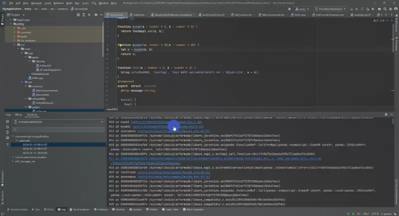 此场景下,DevEco Studio提供混合堆栈定位能力,即在C++ Crash中缝合调用C++方法的ArkTS代码堆栈信息,并将对应代码位置的堆栈进行解码分析,点击链接能够直接跳转到对应的代码行位置,方便开发者查看实际代码调用链,快速定位问题。
