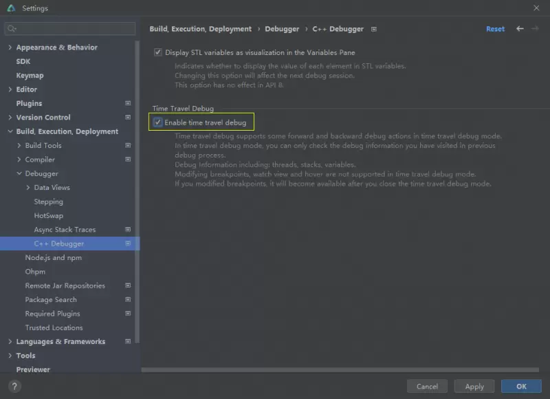 打开File > Settings > Build,Execution,Deployment > Debugger > C++ Debugger设置界面,勾选Enable time travel debug开启C++反向调试。
