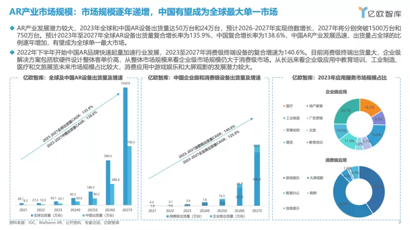 报告指出,AR产业发展潜力较大,2023年全球和中国AR设备出货量达50万台和24万台,预计2026-2027年实现倍数增长,2027年将分别突破1500万台和750万台。预计2023年至2027年全球AR设备出货量复合增长率为135.9%,中国复合增长率为138.6%,中国AR产业发展迅速,出货量占全球的比例逐年增加,有望成为全球单一最大市场。