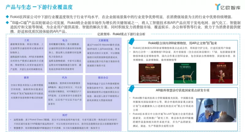 目前,Rokid的下游行业覆盖度领先于行业平均水平,在企业级场景集中的行业竞争优势明显,在消费级场景为主的行业中优势持续增强。目前公司产品在工业、电力、文旅展览、教育、医疗、汽车、办公、娱乐和零售行业等多个板块得到了广泛应用。和展示的文物进行互动、令抽象的知识跃然眼前,对消失的遗址进行复原,还可以让每个工人都能根据实时且可视化的引导来进行精准的作业教育方面,空间计算技术的加入,让教育摆脱空间桎梏,抽象的知识能通过AR技术“真实”地展现在学生眼前,实现教学场景和教学模式的创新。