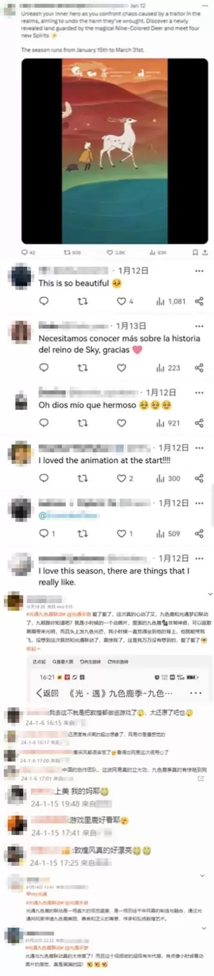 此次联动官宣后不久,《光·遇》所发布的宣传片、季节爆料视频等内容,也在国内外收获热议与大量好评。截止到目前,#光遇九色鹿联动#话题在中文媒体上的传播声量超过3亿,单个联动动画视频全球曝光量超过2000万。