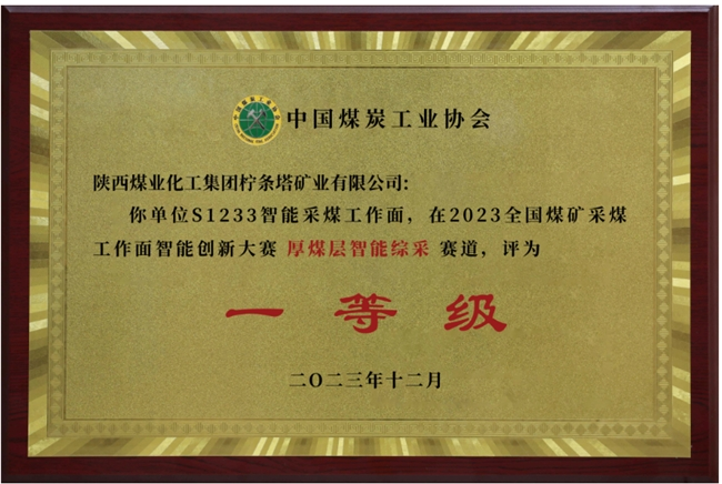 热烈祝贺:柠条塔矿业获得由“中国煤炭工业协会”组织的《2023全国煤矿采煤工作面智能创新大赛》厚煤层智能综采赛道“一等级”荣誉。