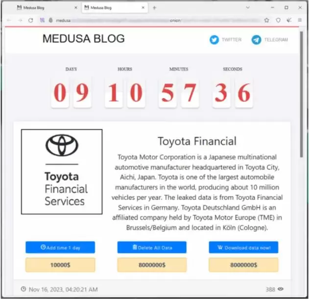 图:Medusa勒索组织在受害者名单中添加了丰田金融服务公司