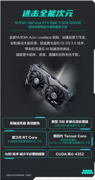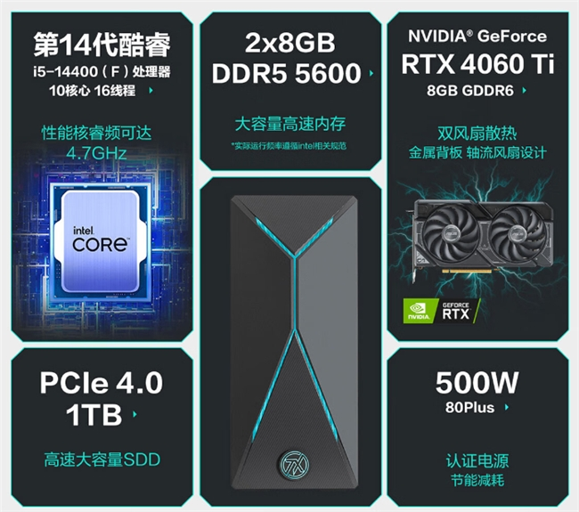 此次新一代华硕天选X2024电竞主机,在显卡方面依然延续玩家熟知的RTX 4060 Ti 8GB高性能显卡,配合全新升级的第14代英特尔®酷睿i5-14400处理器,为玩家带来非凡电竞体验。它的DLSS 3.5技术,引入光线重建功能,可改善光线反射、全局光照和阴影等光线效果,为用户打造更加身临其境的游戏体验。