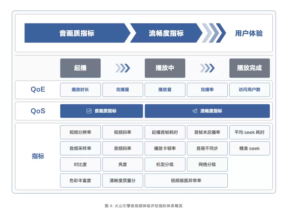 音画质指标和流畅度指标,不仅是影响用户体验的核心指标,更覆盖了音视频内容生产与消费的全链路,涉及上传、存储、媒资处理、分发、播放等多个环节。在音画质指标和流畅度指标的基础上,火山引擎又细分出十余项二级指标进行深入的子模块建模,实现细腻的、动态的体验捕捉,来真实反馈业务情况。
