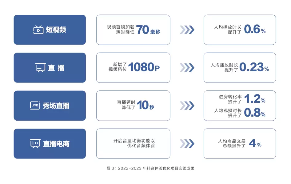 为解决上述问题,火山引擎自2021年起在抖音上线了400余项A/B测试实验,对每一项体验指标优化所带来的业务收益进行量化,最终构建了一套标准透明、度量准确、归因全面、验证可靠的QoS指标体系。并以该指标体系为核心,开发出了音视频体验综合评估模型(MPEI,Multimedia Playback Experience Index),助力企业更好地对用户体验定位归因,优化视频体验,助力业务增长。