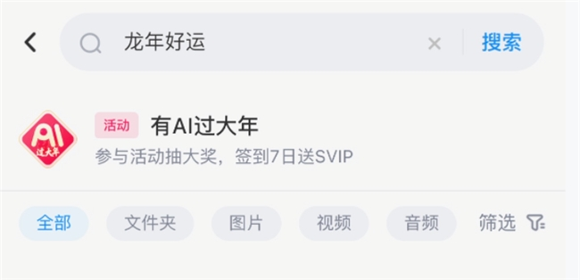 进入百度网盘,搜索“龙年好运”,进入“有AI过大年”活动,即可用AI技术,DIY自己的龙年“行头”,查运势、写祝福!