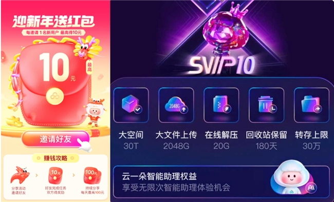 搜索“邀好友”,还能加入邀新人活动。每邀请1名新用户最高可得10元,每天最多可领100元现金,新人首次使用百度网盘,最高还可领200G空间。走亲访友的时候,除了唠嗑还能邀请好友拿现金,今年的红包又多了!同时,百度网盘搜索“新春特惠”,SVIP年卡6.6折,还包含5T空间及54项特权,并可直接升级到SVIP10,享受更多权益。
