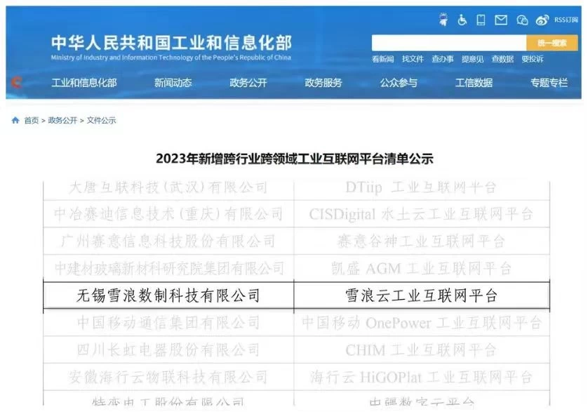 2023年8月,工信部在官网公示了《2023年新增跨行业跨领域工业互联网平台清单》,雪浪云工业互联网平台成功入选,标志着雪浪云成功晋级工业互联网平台“国家队”。这不仅是对雪浪云五年来沉淀出的平台实力最权威的认可,更是对雪浪云产品、技术、服务以及品牌发展和影响等方面综合实力的充分肯定。