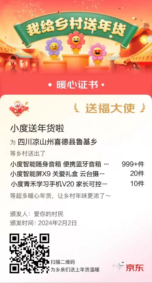 京东发起“我给乡村送年货”活动得到了社会各界的积极响应,小度携手小度青禾为四川省凉山州送出了超1000件心意年货,包括小度智能随身音箱、小度智能屏X9关爱礼盒和小度青禾学习手机V20等年货,让大凉山的村民们也能过一个暖心年。