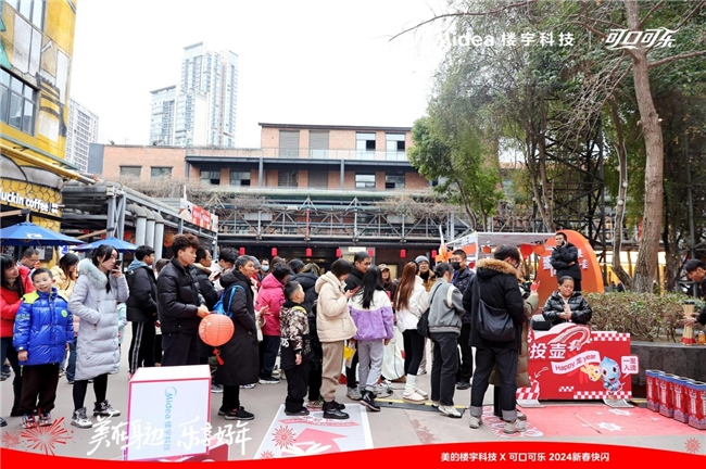 2月3日南方小年当天,成都东郊记忆东舞台一侧人头攒动,排起长队,原来是美的楼宇科技与中粮可口可乐的线下快闪活动吸引了众多市民的热情参与。活动现场布置了红火喜庆的新春打卡装置,并将美的楼宇科技的样板工程巧妙嵌入打卡墙,让许多不了解美的楼宇科技的市民也领略到其在智慧建筑领域的卓越成果和服务能力。