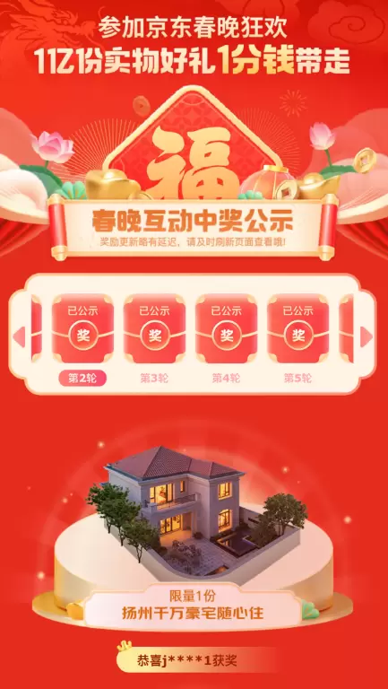 作为2024年总台春晚独家互动合作平台,京东联合众多品牌为全球华人带来1亿份实物好礼和30亿红包,用户在京东的互动量超552亿次!其中,最引人瞩目的价值千万扬州芳甸独栋豪宅一年使用权、京东房产提供的北戴河临海精装公寓分别在第二、三波超级大奖开出。