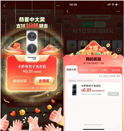 除房产外,京东家电家居还在春晚期间送出150台单价20000元的卡萨帝F2洗干集成机、500台总价值超150万的格力云佳空调、2000套总价值超200万元的富安娜100%新西兰进口羊毛被,以及100英寸创维酷开电视、追觅洗地机、九阳茶吧机、九牧智能马桶、飞利浦小夜灯、爱仕达奶锅、乐扣乐扣保温杯、苏泊尔保温杯等总价超千万的家电家居实物好礼,让大家在欢乐祥和的气氛中欢度龙年春节。