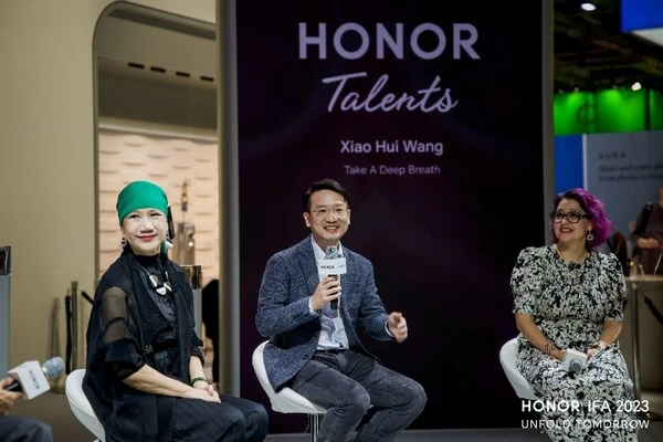 德国IFA展“科技与艺术融合”圆桌论坛,从左至右为旅德跨界艺术家王小慧、荣耀CMO郭锐、墨西哥当代艺术家YUNUENE