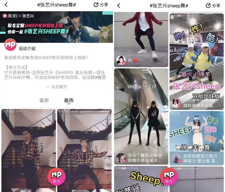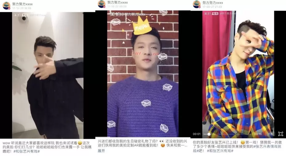 2016年张艺兴工作室成立一周年当天,张艺兴就在美拍开启直播与粉丝分享心情,只有25分钟不到的直播时间,聚集了16万的在线观众,点赞数直破400万。2017年10月,张艺兴发布第二张个人专辑时,就在美拍上教粉丝跳主打歌舞蹈《SHEEP》,活动开启后超9000位美拍用户和达人参与,活动话题播放量超1.5亿。