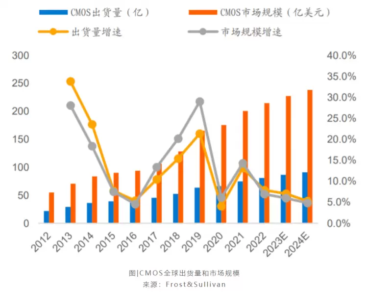 依据最新数据显示,全球CMOS成像芯片市场规模由2017年的139.05亿美元增长至2022年的233.66亿美元,复合年均增长率达66.0%,预计2023年将达253.13亿美元。CMOS成像芯片在国内也处于高速发展的阶段,预计到2024年国内CMOS成像芯片市场规模将达到516.5亿元。